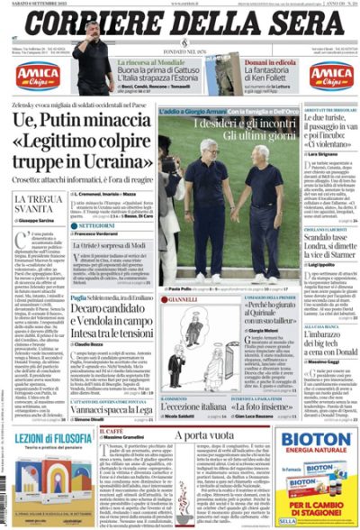 Sulla maggior parte dei giornali di oggi l’apertura è dedicata alle parole del presidente russo Putin, che intervenendo al Forum economico orientale a Vladivostok, in Russia, ha detto che i militari stranieri che potrebbero essere schierati in Ucraina secondo le indicazioni della cosiddetta “coalizione dei volenterosi” sarebbero considerati “un bersaglio legittimo” per l’esercito russo. Il Giornale apre invece sull’ipotesi di riduzione dell’IRPEF a cui starebbe lavorando il governo, il Manifesto titola sulle operazioni militari israeliane a Gaza City, e Libero e il Tempo criticano la CGIL e il suo segretario Landini per gli scioperi in programma nel mese di settembre. I giornali sportivi commentano la vittoria per 5-0 dell’Italia contro l’Estonia in una partita di qualificazione ai Mondiali maschili di calcio.