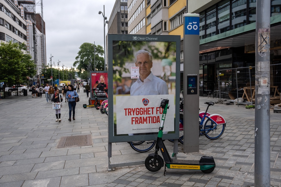 Un manifesto elettorale dell’attuale primo ministro Laburista Jonas Gahr Støre a Oslo (Carl Court/Getty Images)