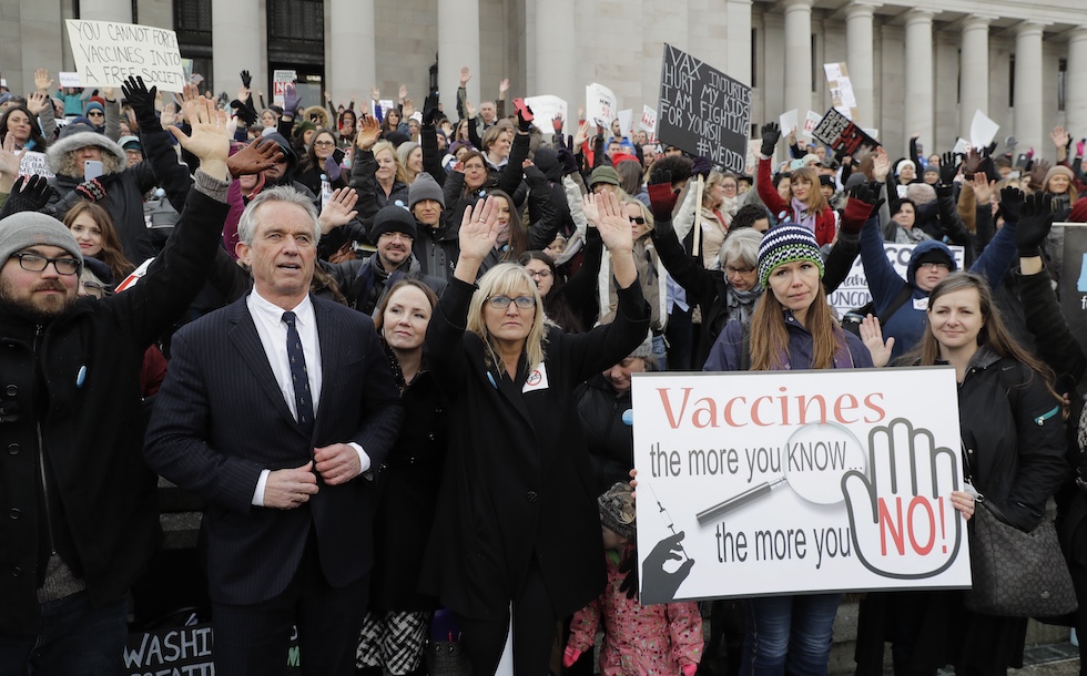 Robert F. Kennedy Jr. nel 2019 a una protesta contro l’eliminazione dell’esenzione ideologica per i vaccini contro morbillo, parotite e rosolia nei bambini (AP Photo/Ted S. Warren)