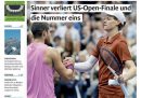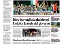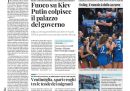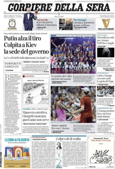 Sulla maggior parte delle prime pagine di oggi l’apertura si divide fra l’ennesimo attacco massiccio russo sull’Ucraina, che ha colpito anche il palazzo del governo ucraino a Kiev, e le notizie sportive, con la vittoria dell’Italia nei Mondiali femminili di pallavolo e la sconfitta di Sinner contro Alcaraz nella finale del singolare maschile degli US Open di tennis. Qualche giornale apre invece sull’intervento al forum di Cernobbio del ministro dell’Economia Giorgetti, che ha escluso una manovra economica correttiva nella prossima legge di bilancio.