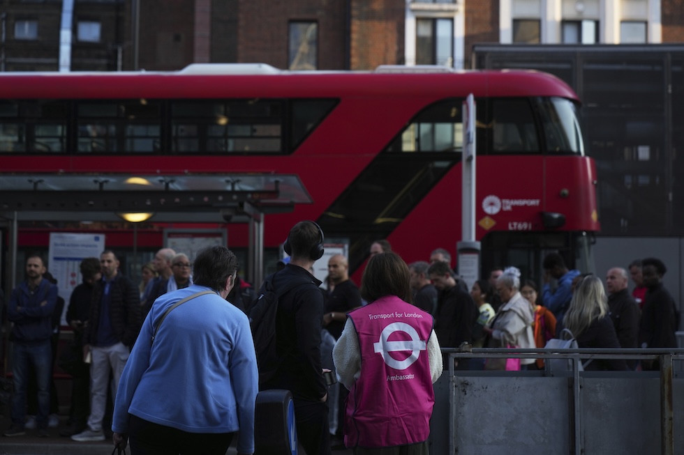 Persone che cercano di prendere l’autobus durante lo sciopero della metropolitana a Londra, 8 settembre 2025 (AP Photo/Joanna Chan)