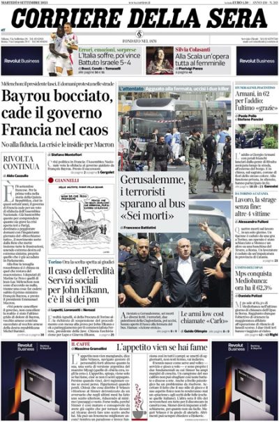 Sono due le notizie principali su cui aprono i giornali di oggi: il voto di sfiducia dell’Assemblea Nazionale francese al governo del primo ministro Bayrou e le prospettive per la formazione di un nuovo governo in una situazione politica di grande instabilità, e l’attacco armato a un autobus a Gerusalemme da parte di due attentatori che hanno sparato uccidendo sei persone, prima di essere uccisi da un membro delle forze di sicurezza israeliane. Il Sole 24 Ore titola sul successo dell’offerta pubblica di acquisto e scambio di MPS su Mediobanca, mentre i giornali sportivi commentano la vittoria dell’Italia per 5-4 contro Israele in una partita del girone di qualificazione ai Mondiali maschili di calcio del 2026.