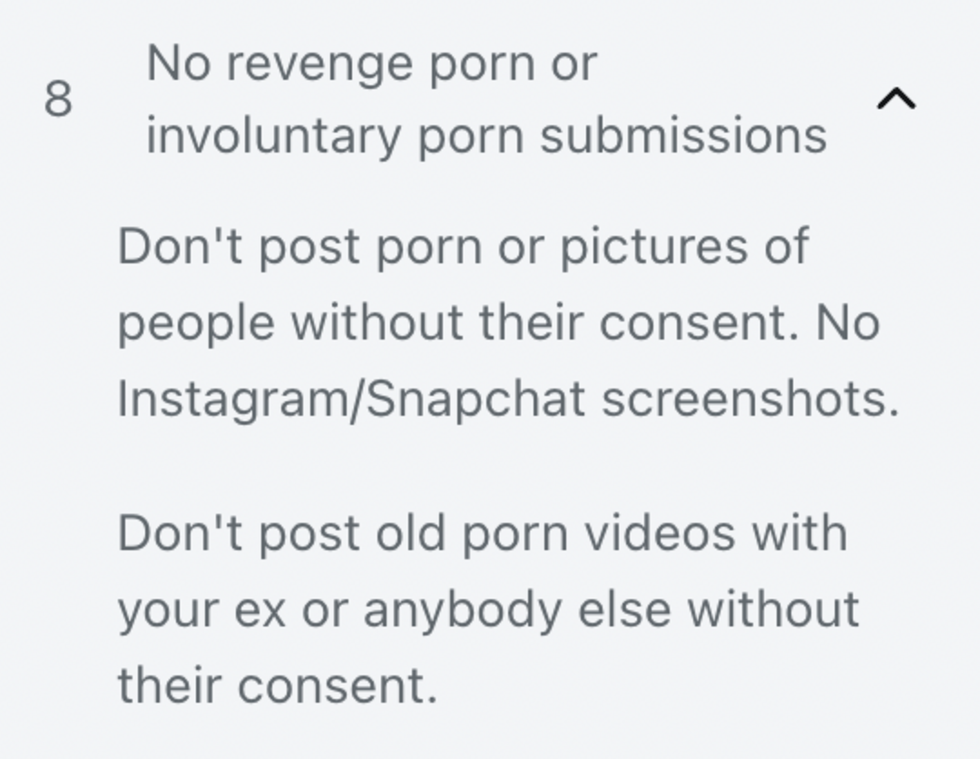 Il subreddit r/gonewild, per esempio, ha 5 milioni di follower: in base alla descrizione, è uno spazio dove «adulti di mentalità aperta possono condividere i loro corpi nudi, mostrandoli in un ambiente accogliente e senza pressioni». La prima volta che una persona prova a pubblicare un post, i moderatori gli chiedono di verificare la sua identità, in modo da assicurarsi per quanto possibile che a pubblicare i contenuti sia effettivamente la persona ritratta. Altri subreddit molto popolari scrivono esplicitamente, tra le regole della comunità, «No revenge porn», «No foto prese da Instagram o Snapchat», ma anche «Non provate a indovinare l’identità di qualcuno o a cercarla su altri social network».