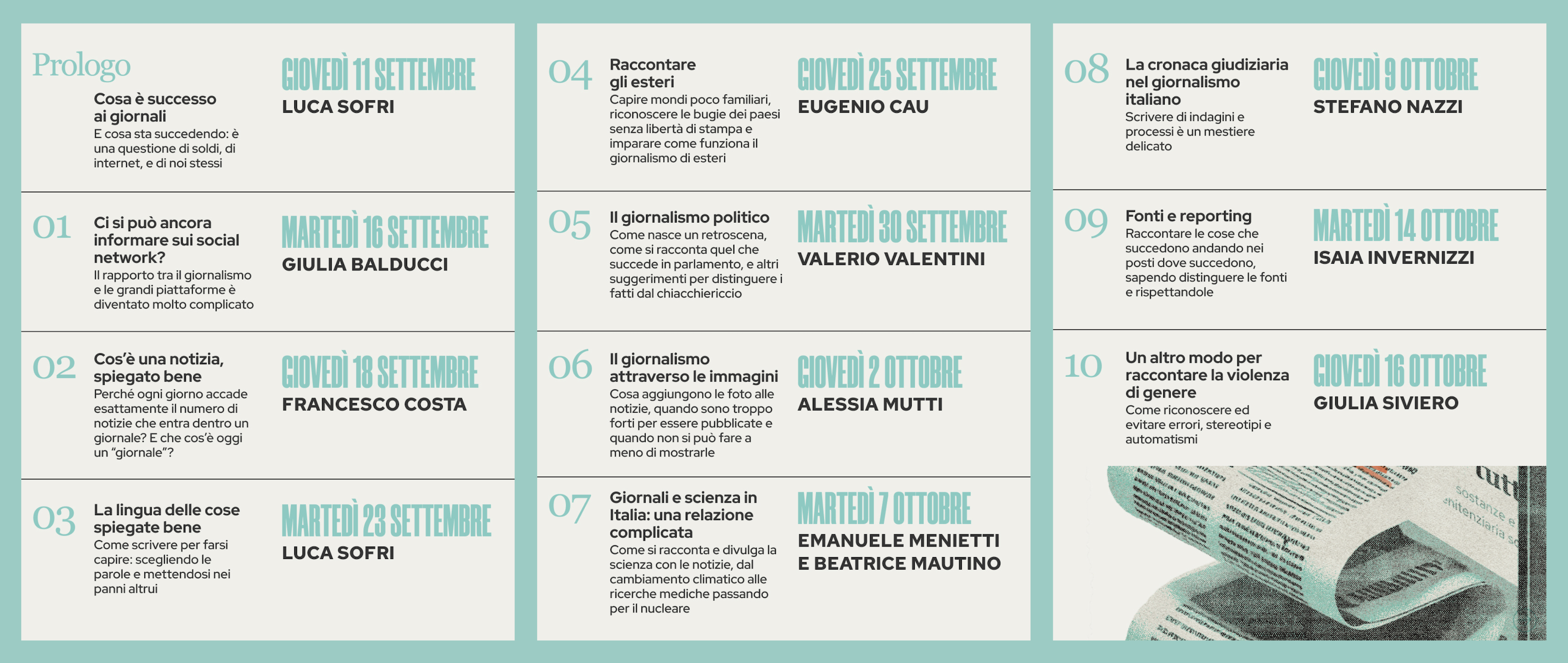 Durante le lezioni si parlerà di come è cambiato il modo di informare e informarsi, di come nascono e vengono decise le notizie, e dei passaggi che si devono fare prima della loro pubblicazione: dalla ricerca e dalla verifica delle fonti, alla scelta delle immagini e delle parole più adatte per spiegare e raccontare pezzi del nostro paese e del mondo – come la cronaca politica e giudiziaria, le questioni di genere, gli esteri, la scienza – oltre che dei mezzi e strumenti migliori per condividerle, le notizie.