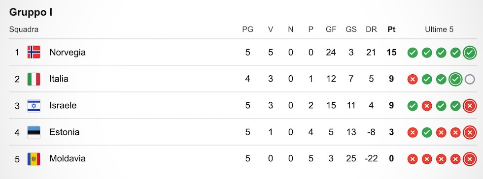 In caso di arrivo a pari punti, infatti, il primo criterio considerato è la differenza gol e non gli scontri diretti, e quindi all’Italia non basterebbe nemmeno ribaltare il 3-0 subìto all’andata in Norvegia nella partita di ritorno (cosa già di per sé difficile).