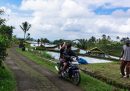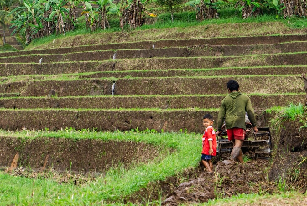 Un bambino segue suo padre al lavoro nelle risaie di Jatiluwih, a Bali (Valerio Valentini/Il Post)