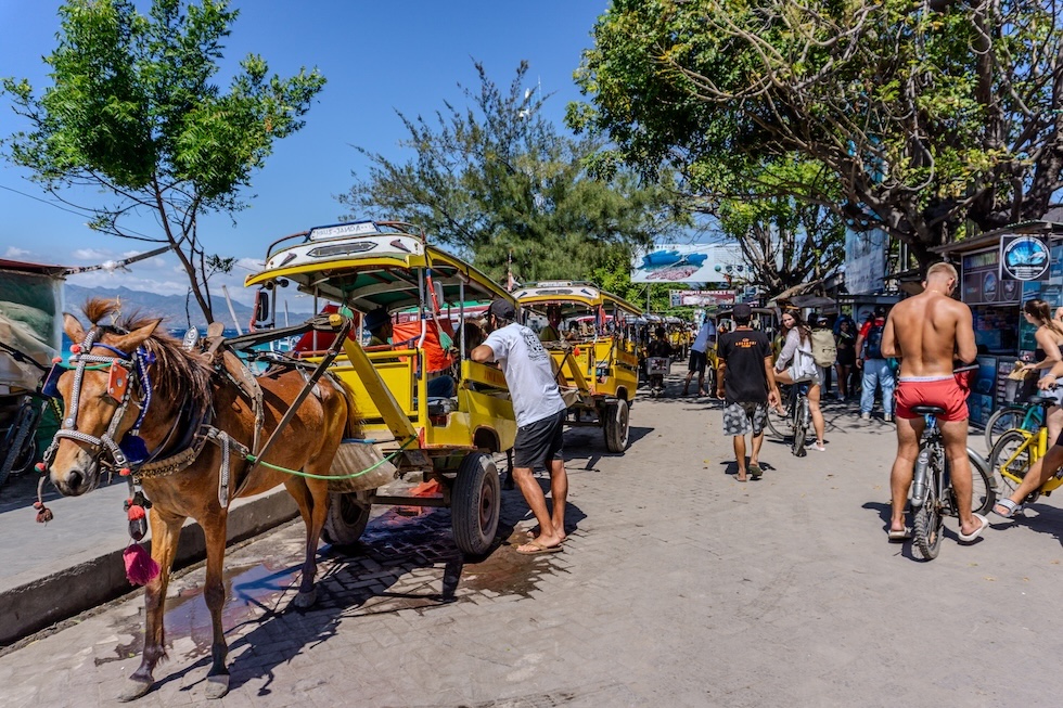 Ma del resto qui a Gili Trawangan – la più grande di queste tre striminzite isole a nord ovest di Lombok, dove più grande significa tre chilometri di lunghezza per due di larghezza, una superficie che è poco più della metà di Ponza – ci si muove così: su dei carretti trainati da cavalli imbellettati con una ricca bardatura variopinta, tipo quelli siciliani ma assai meno raffinati, con corredo di campanelli e campanacci a segnalarne il transito. Cercando su internet informazioni generali sulle Gili, il ricorso esclusivo a questo traffico equino è una delle curiosità in cui più facilmente ci s’imbatte: e, siccome i tempi lo impongono, il progressista mondo del web è pieno di travel influencer e travel vlogger che, da bravi travèt del pol. corr. digitale, pubblicano questi video in cui si mostrano, appena sbarcati a Trawangan, preoccupati per le condizioni degli animali, e se ne accertano coi proprietari prima di acconsentire a lasciarsi portare in giro per l’isola. E va detto che qualcosa, questa nuova sensibilità animalista l’ha ottenuta: pare cioè che davvero, rispetto a una decina d’anni fa, il trattamento riservato a questi infaticabili trasportatori di turisti e valigie sia di gran lunga migliorato, e quelle foto «raccapriccianti di cavalli scheletrici, visibilmente sottopeso e con le costole in vista» — così si legge su Tripadvisor, ed era il 2014 — siano testimonianza di una barbarie dismessa. Evidentemente i locali hanno capito che alle ansie dei turisti occidentali più zelanti bisognava iniziare a badare, per evitare di perdere clientela.