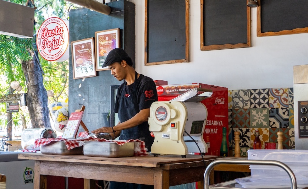 Sul viale principale, davanti al molo, ci sono decine di posti che propongono cibo europeo: qui, un ragazzo indonesiano che tira la pasta all’uovo in un improbabile ristorante italiano (Valerio Valentini/Il Post)