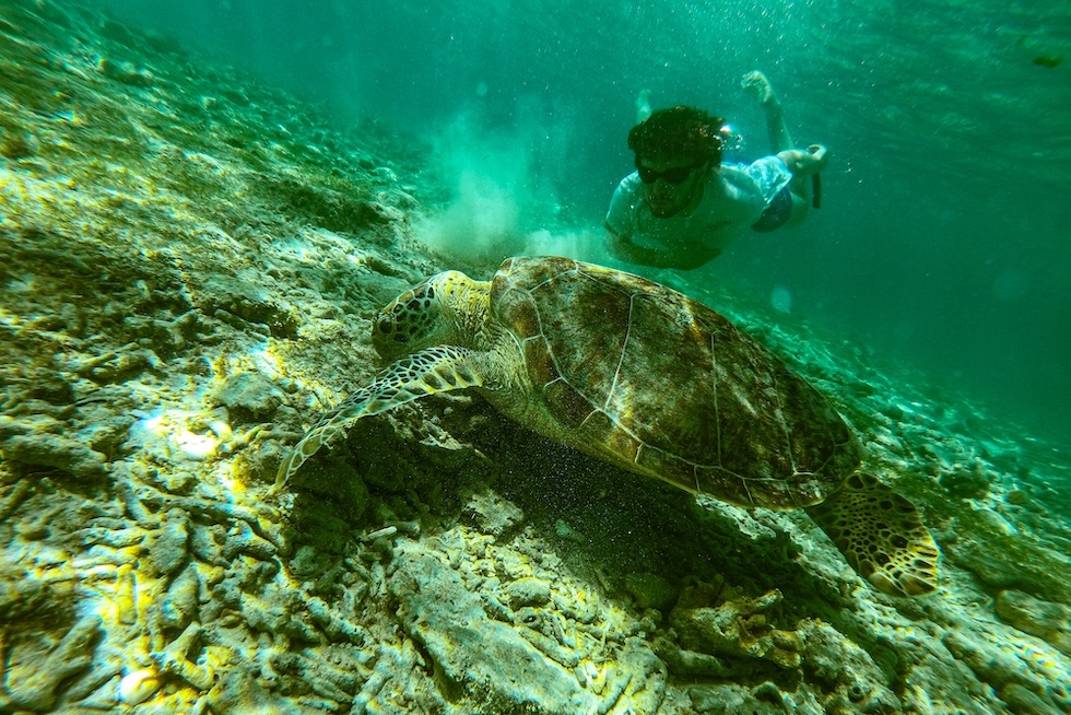 Non, ad esempio, se si prende uno di queste decine – decine? forse centinaia – di mozzi che portano mandrie di supposti appassionati di snorkeling al largo, per godere della biodiversità del triangolo corallino, quella biodiversità su cui però è un andirivieni di flottiglie di barche sulla cui motorizzazione non so dire, ma che a giudicare dalla puzza di kerosene e dalla nuvola nerissima che si crea a ogni sgasata non deve fare bene; quella biodiversità su cui nessuno si premura di raccomandarci di non camminare allegramente con le pinne – e anzi, il sedicente istruttore che c’accompagna non fa altro che distribuire maschera e boccaglio, chiedere conferma, ma senza davvero attendere la risposta, che tutti siamo esperti nuotatori, per poi tuffarsi dalla barca gridando «Enjoyyy», tipo «Banzai».