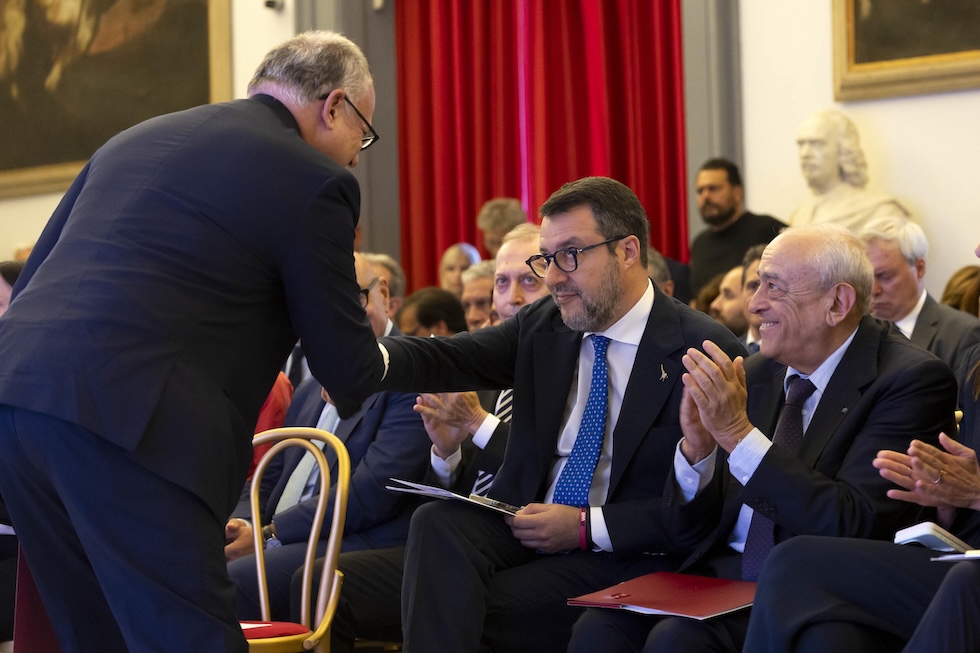 A destra Francesco Gaetano Caltagirone, accanto al ministro delle Infrastrutture Matteo Salvini, mentre questo stringe la mano al sindaco di Roma Roberto Gualtieri (ANSA/MASSIMO PERCOSSI)