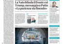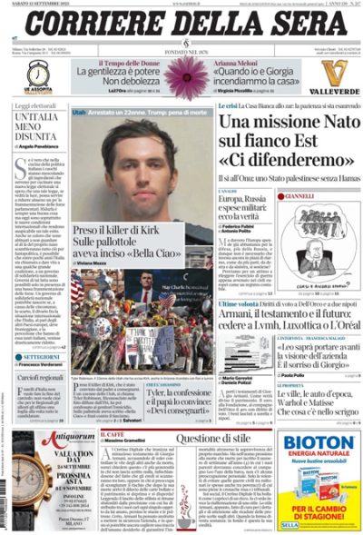 Le due notizie principali su cui aprono quasi tutti i giornali di oggi sono la decisione della NATO di una nuova missione per rinforzare i confini orientali dell’Europa, dopo l’invasione dello spazio aereo polacco da parte di droni russi, e l’arresto del presunto assassino dell’attivista della destra statunitense Charlie Kirk, per il quale il presidente degli Stati Uniti Trump ha detto di volere che sia condannato a morte. Avvenire titola invece sulla risoluzione approvata dall’Assemblea generale dell’ONU che chiede il riconoscimento dello stato della Palestina, mentre i giornali sportivi presentano la giornata del campionato di Serie A maschile di calcio, che riprende oggi dopo la pausa per le nazionali.