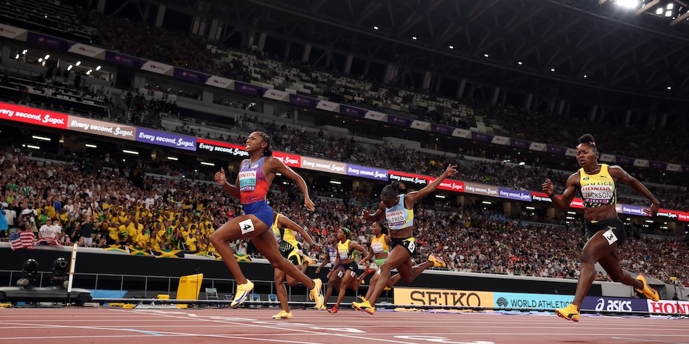 Nella finale maschile dei 100 metri ai Mondiali di atletica leggera di Tokyo c’è stata una doppietta giamaicana: è arrivato primo il ventiquattrenne Oblique Seville, che ha corso in 9,77 secondi (il suo miglior tempo), e secondo il suo coetaneo e connazionale Kishane Thompson in 9,82 secondi. Lo statunitense Noah Lyles, campione olimpico e mondiale in carica nei 100 metri, è arrivato terzo in 9,89 secondi.