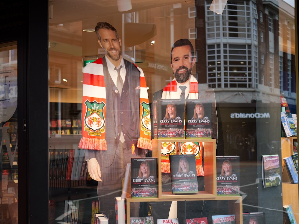 Il cartonato dei proprietari, gli attori Ryan Reynolds e Rob McElhenney, nella vetrina di una libreria, il 3 settembre (Matteo Castellucci/il Post)