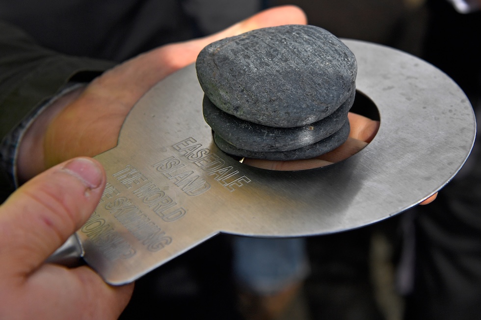 Il cosiddetto anello della verità, lo strumento con cui vengono misurati i sassi. Easdale, 25 settembre 2016 (Jeff J Mitchell/Getty Images)