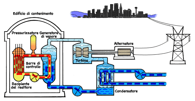 Il sistema teorizzato dai Muller riprende quello dei reattori nucleari ad acqua pressurizzata (PWR), tra i più comuni e impiegati in decine di centrali in giro per il mondo. Utilizzano due circuiti isolati l’uno dall’altro, nei quali circola dell’acqua che permette gli scambi di calore per produrre l’energia elettrica. Il circuito primario è formato da un recipiente in pressione, una sorta di grande pentola a pressione, nel quale è contenuto il nocciolo formato dal combustibile nucleare, che durante i processi di fissione produce molto calore. L’acqua che ha intorno si scalda e viene fatta circolare verso il circuito secondario (che essendo completamente isolato dal primo non è radioattivo), dove fa scaldare altra acqua fino a farla diventare vapore, che aziona poi delle turbine per la produzione dell’energia elettrica tramite un alternatore.