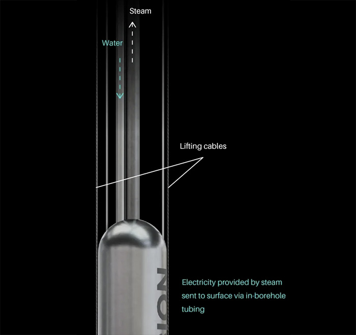 In un lungo tubo che arriva quasi alla superficie viene inserita l’acqua, la cui massa nell’alta colonna è tale da produrre la pressione necessaria nel reattore per evitare che l’acqua stessa diventi vapore. In questo modo, dice la società, si può ottenere un circuito primario più semplice. Altra acqua, non radioattiva e isolata nel circuito secondario, viene scaldata e il vapore ottenuto, una volta in superficie, aziona le turbine per poi produrre energia elettrica. Un po’ come avviene in alcuni tipi di centrali che sfruttano l’energia geotermica, ma sfruttando il calore prodotto da un reattore.