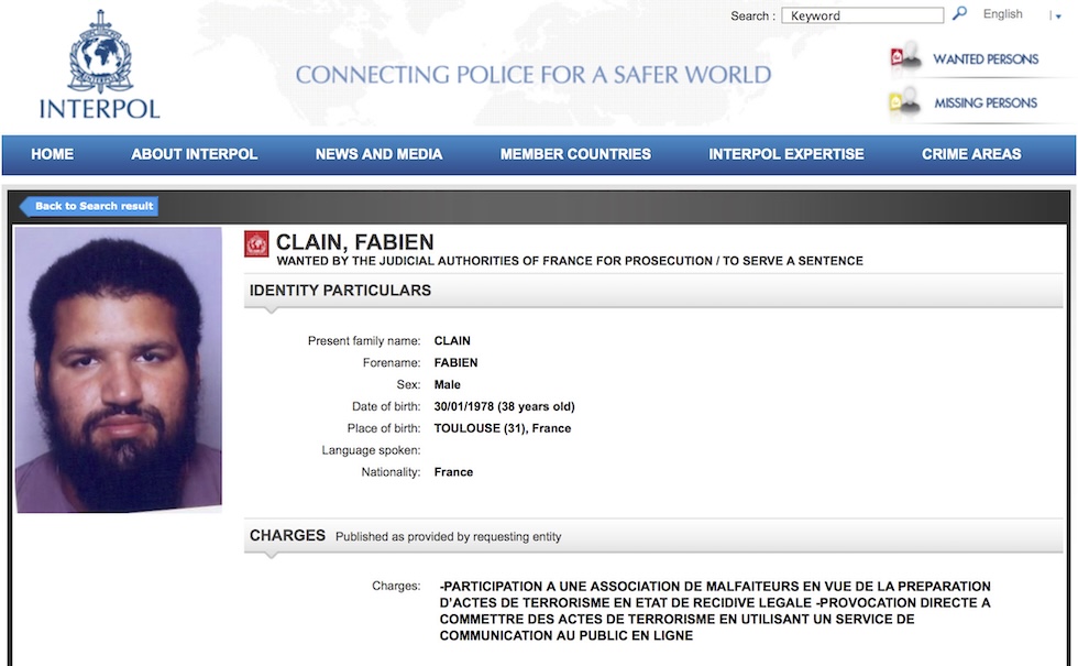 Un fermoimmagine del 2016 della pagina di Fabien Clain sul sito dell’Interpol (Interpol via AP)