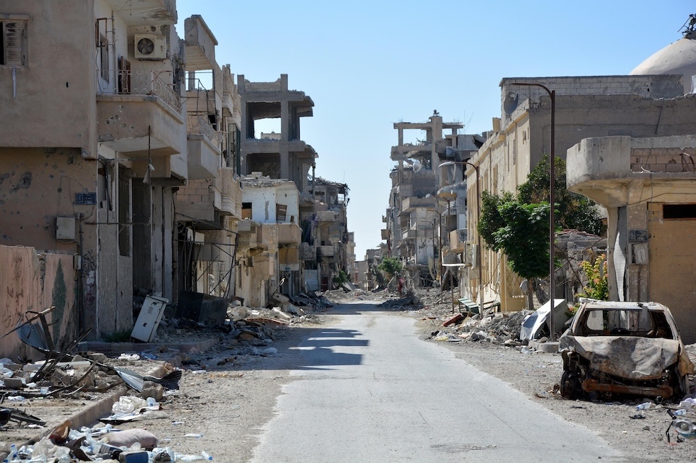 Una strada centrale di al Raqqa, in Siria, il 18 ottobre 2017, dopo la ritirata dello Stato Islamico (ANSA/EPA/YOUSSEF RABIH YOUSSEF)