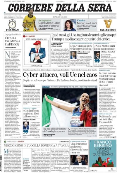 Una delle notizie più presenti sulle prime pagine di oggi, domenica 21 settembre, è il malfunzionamento che sabato ha provocato ritardi e guai in diversi aeroporti europei, forse a causa di un attacco informatico. I principali quotidiani aprono sulle tensioni tra Occidente e Russia, mentre il manifesto dedica la sua prima pagina alla questione del riconoscimento dello Stato di Palestina. Sugli sportivi si parla soprattutto della netta vittoria del Milan a Udine, del pareggio della Juventus a Verona e del bronzo di Nadia Battocletti nei 5mila metri ai Mondiali di atletica.
