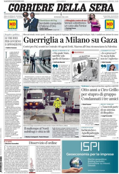 L’apertura di tutti i giornali di oggi è dedicata alle manifestazioni organizzate in molte città italiane in occasione dello sciopero generale in sostegno alla popolazione palestinese, e agli scontri alla stazione Centrale di Milano fra un gruppo di manifestanti e la polizia. La Stampa decide invece di aprire sulla decisione della Francia di riconoscere lo stato di Palestina, annunciata dal presidente Macron all’Assemblea generale delle Nazioni Unite, e i giornali sportivi titolano sulla vittoria contro il Pisa del Napoli, che va così in testa alla classifica della Serie A maschile di calcio.