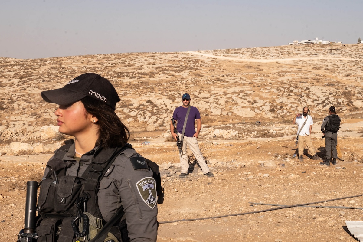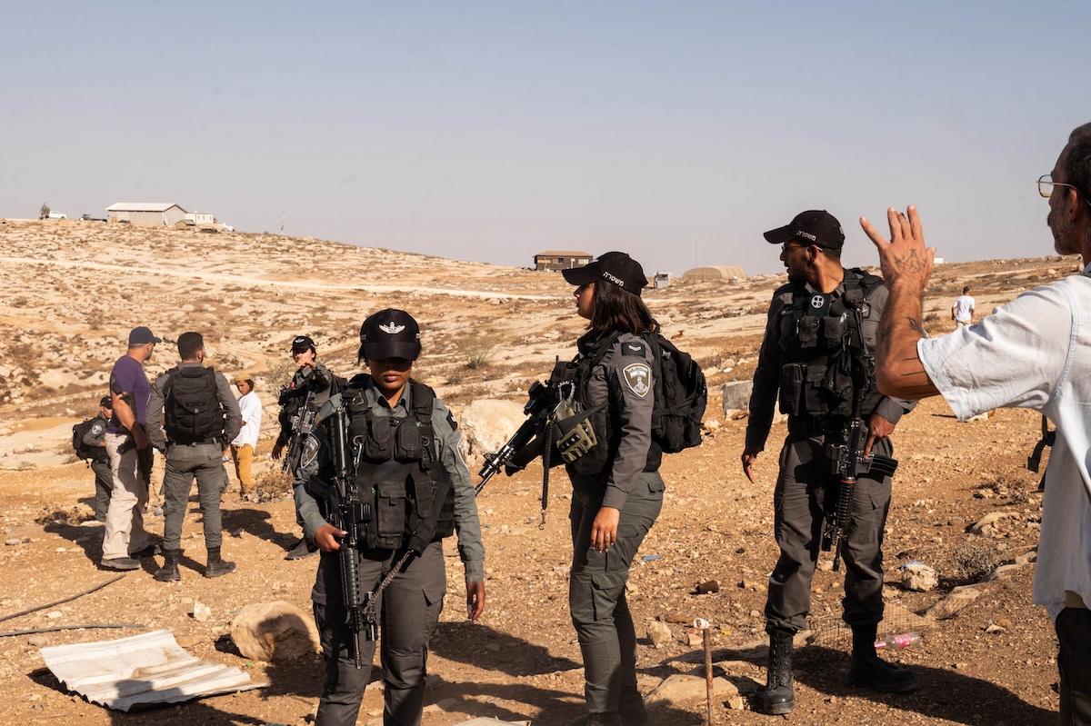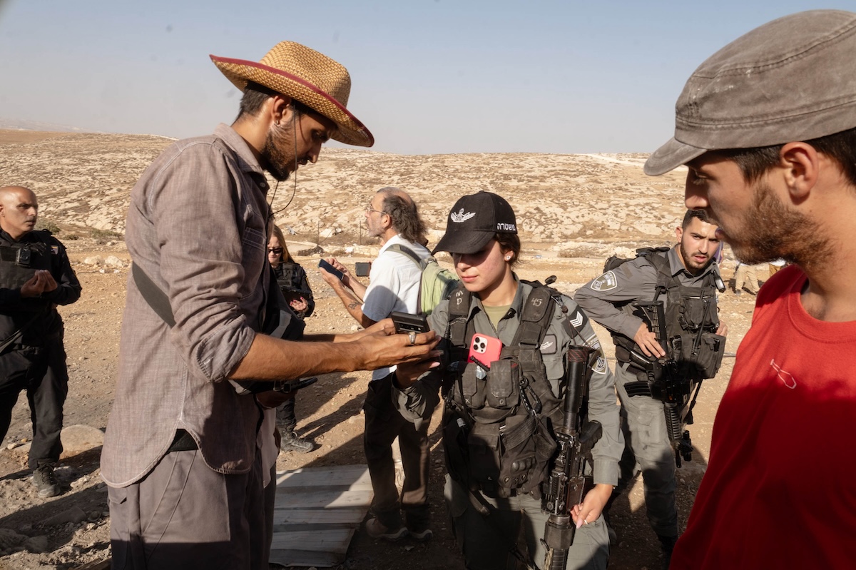 La polizia israeliana mentre parla con coloni e attivisti (Gabriele Micalizzi, CESURA, per il Post)