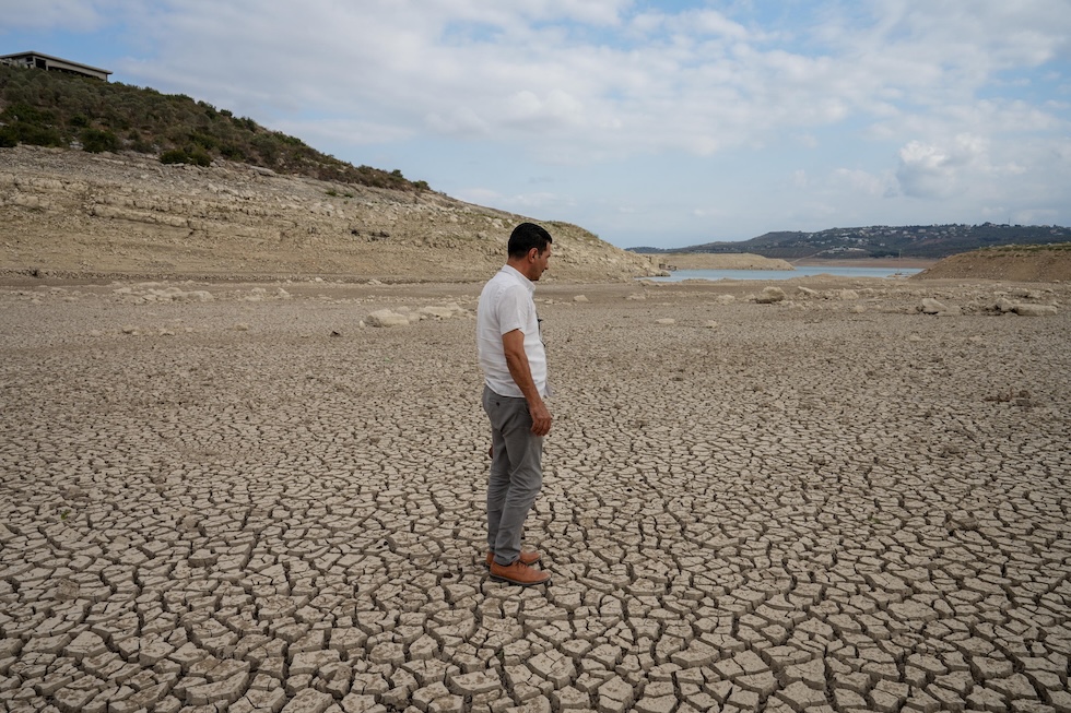 Osama Darghal, residente della zona della città di Safita, dentro alla diga prosciugata di Abrash, nell’ovest della Siria, il 9 settembre 2025 (ANSA/EPA/AHMAD FALLAHA)