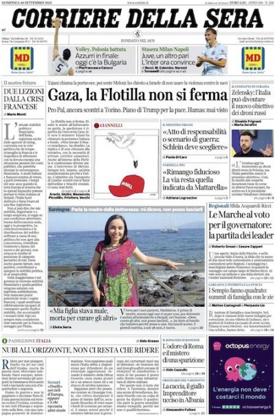 I quotidiani di stamattina dedicano le proprie prime pagine soprattutto alla scelta della Global Sumud Flotilla di proseguire verso la Striscia di Gaza nonostante la richiesta del presidente della Repubblica italiana Sergio Mattarella di fermarsi a Cipro e consegnare lì il proprio carico di aiuti. Si parla anche delle elezioni regionali nelle Marche, dove si voterà fino a lunedì, e della imminente finale dei Mondiali maschili di pallavolo fra Italia e Bulgaria.