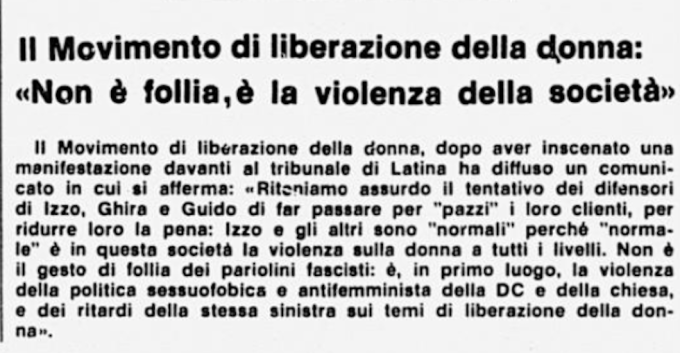 Il “massacro del Circeo” fu uno dei fatti di cronaca più sconvolgenti della storia d’Italia degli anni Settanta, e fu anche uno spartiacque nella storia del femminismo e non solo: perché per la prima volta, a fronte di un racconto giornalistico distorto, le femministe riuscirono a imporre l’idea della violenza di genere come qualcosa di quotidiano, strutturale e trasversale; perché quel processo segnò la trasformazione di parte del movimento in associazioni riconosciute che per la prima volta poterono costituirsi parte civile; perché, e sempre per la prima volta, emerse la violenza che le donne vittime di violenza subivano in un secondo momento (e spesso ancora subiscono) nelle aule di tribunale.