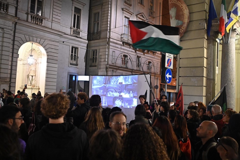 Persone guardano la diretta dell’intercettazione delle barche della Flotilla su un maxi schermo in piazza Palazzo di Città a Torino, 1 ottobre 2025 (ANSA/ALESSANDRO DI MARCO)