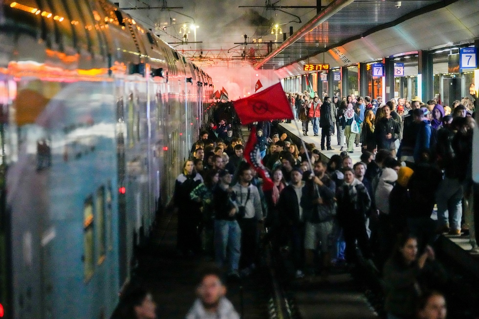 Manifestanti bloccano il passaggio dei treni sui binari della stazione Cadorna a Milano, 1 ottobre 2025 (AP Photo/Luca Bruno)