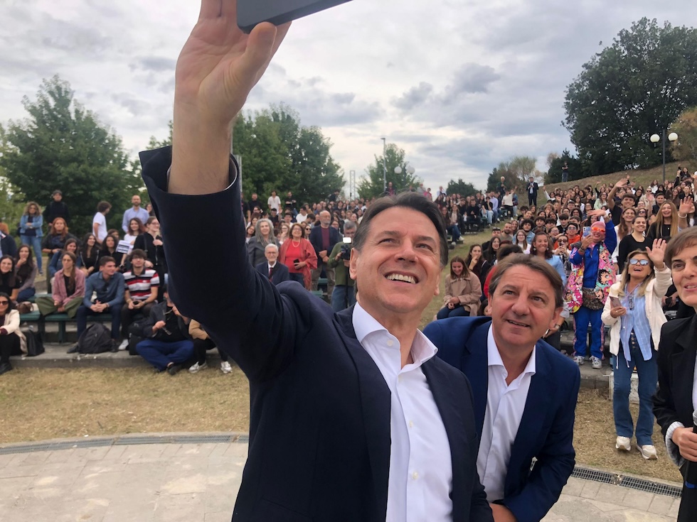 Tridico insieme al leader del M5S Giuseppe Conte durante un comizio a Cosenza, 1 ottobre 2025 (ANSA/Elvira Madrigrano)