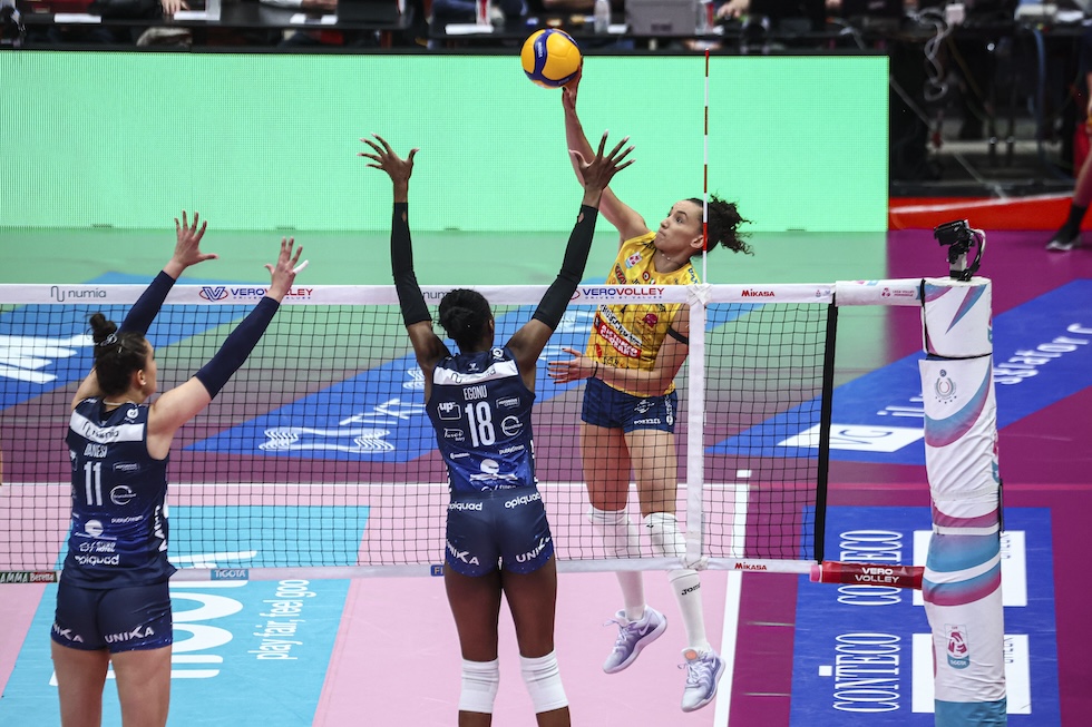 Tra le tre principali rivali di Conegliano, comunque, l’unica in grado di batterla nella scorsa stagione era stata Novara, che aveva vinto la seconda partita delle semifinali Scudetto (perdendo le altre tre) per 3 set a 0, in quella che per Conegliano era stata la prima sconfitta dopo cinquanta vittorie consecutive.