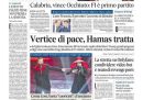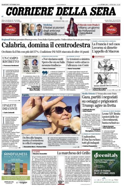 Sono diverse le notizie in apertura sui giornali di oggi: alcuni si occupano delle elezioni regionali in Calabria, vinte nettamente dal candidato della coalizione di destra Roberto Occhiuto, altri titolano sull’inizio delle trattative fra Israele e Hamas a Sharm el Sheikh, in Egitto, per far finire la guerra nella Striscia di Gaza, altri ancora ricordano l’anniversario delle stragi compiute da Hamas due anni fa, e qualcuno apre sulle dimissioni del primo ministro francese Lecornu il giorno dopo aver annunciato il suo nuovo governo.