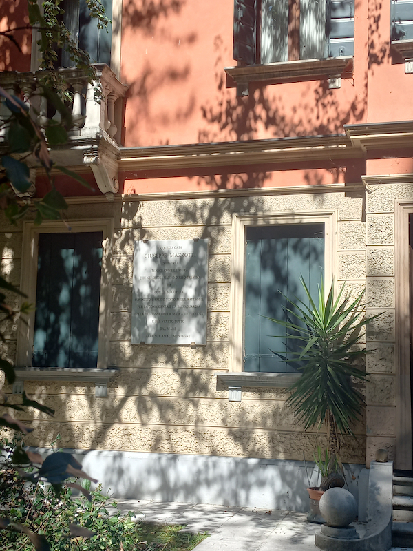 Per chiudere il cerchio di questa lunga indagine e ripercorrere davvero tutti i passi di Buzzati, serviva un altro tassello: la casa di Bepi Mazzotti, ossia il luogo dove si svolge la famosa seduta spiritica in cui la “caramella rossa di marca inglese” si materializza cadendo al centro del tavolo. Ecco, devo ammettere che questa l’ho trovata per puro caso, passeggiando con il mio cane e notando sulla facciata di una bella villetta color mattone una lapide commemorativa alla memoria di Mazzotti. Si affaccia sul Put, la circonvallazione di Treviso, e oggi è soffocata dal traffico e dal frastuono. Quando l’ho individuata, mi sono accorta che era in vendita, ho anche avuto modo di guardare le foto dell’annuncio immobiliare e immaginare Buzzati & company riuniti nel grande salotto attorno alla tavoletta ouija o qualcosa del genere. C’è stata, a un certo punto, anche una mezza idea di fingermi interessata per andarla a visitare, ma alla fine mi è mancato il coraggio. Me ne pento amaramente.