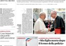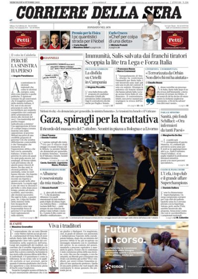 Le notizie principali su cui aprono i giornali di oggi riguardano la situazione nella Striscia di Gaza: l’andamento dei negoziati fra Hamas e Israele in Egitto, con l’opposizione di Hamas al punto del piano di pace del presidente degli Stati Uniti Trump che prevede un ruolo dell’ex primo ministro britannico Blair nella gestione della Striscia di Gaza, la polemica fra Israele e Vaticano, con le accuse dell’ambasciatore israeliano al segretario di Stato vaticano Parolin che aveva denunciato sia le stragi di Hamas del 7 ottobre che il massacro compiuto da Israele a Gaza, e una nuova missione di barche della Freedom Flotilla che si sta avvicinando alla Striscia. Qualche giornale apre invece sul voto del Parlamento europeo che ha confermato l’immunità per l’europarlamentare italiana Ilaria Salis, altri si occupano dell’intervista televisiva alla presidente del Consiglio Meloni, che fra le altre cose ha detto di essere stata denunciata alla Corte penale internazionale per concorso in genocidio.