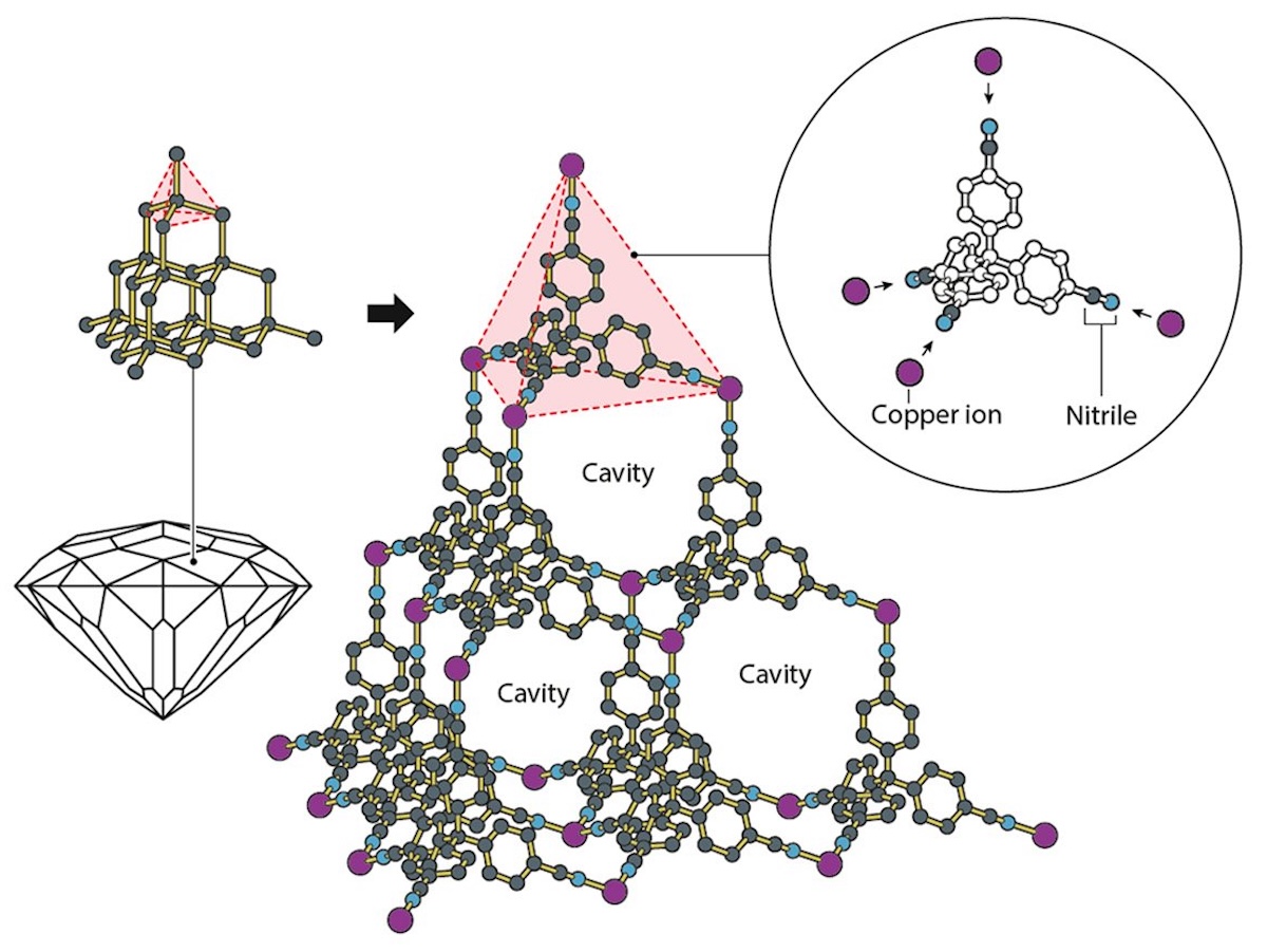 Richard Robson si ispirò alla struttura del diamante (ogni atomo di carbonio si lega a quattro altri formando una piramide). Usò ioni di rame e una molecola a quattro braccia, combinandoli, e ottenne un cristallo ordinato e molto spazioso (Nobel Prize)