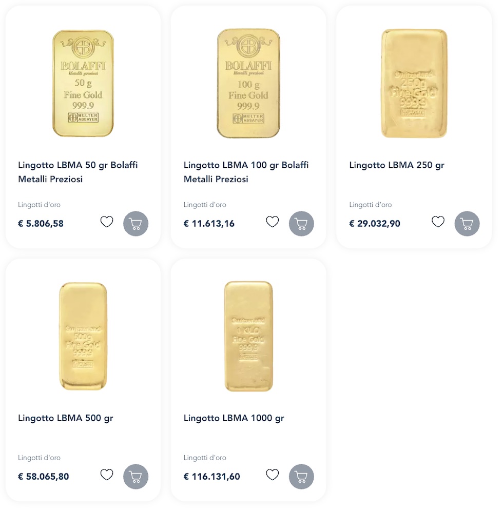 Il taglio più accessibile è quello delle monete, che infatti come ricorda Bolaffi un tempo si usava regalare in occasione dei battesimi: quelle più comuni sono la sterlina britannica da investimento, che ai valori odierni vale circa 850 euro nella sua forma più basica, e il marengo, un particolare tipo di moneta europea coniata nel 1800, e che si trova tra i 600 e 700 euro. Il mercato del collezionismo è un’altra cosa: il valore delle monete da collezione non dipende solo dall’oro che contengono, ma anche dalla loro rarità, per esempio. Altrimenti ci sono i lingotti, il cui valore varia a seconda del peso, che può andare dai 50 grammi (circa 5.800 euro ai valori attuali) a un chilo (circa 116mila euro).