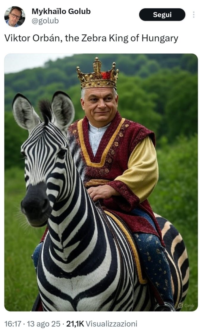 Una delle tante immagini realizzate con l’intelligenza artificiale per criticare Orbán, la sua relazione con Mészáros e la sua presunta passione per le zebre.