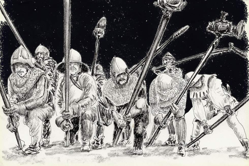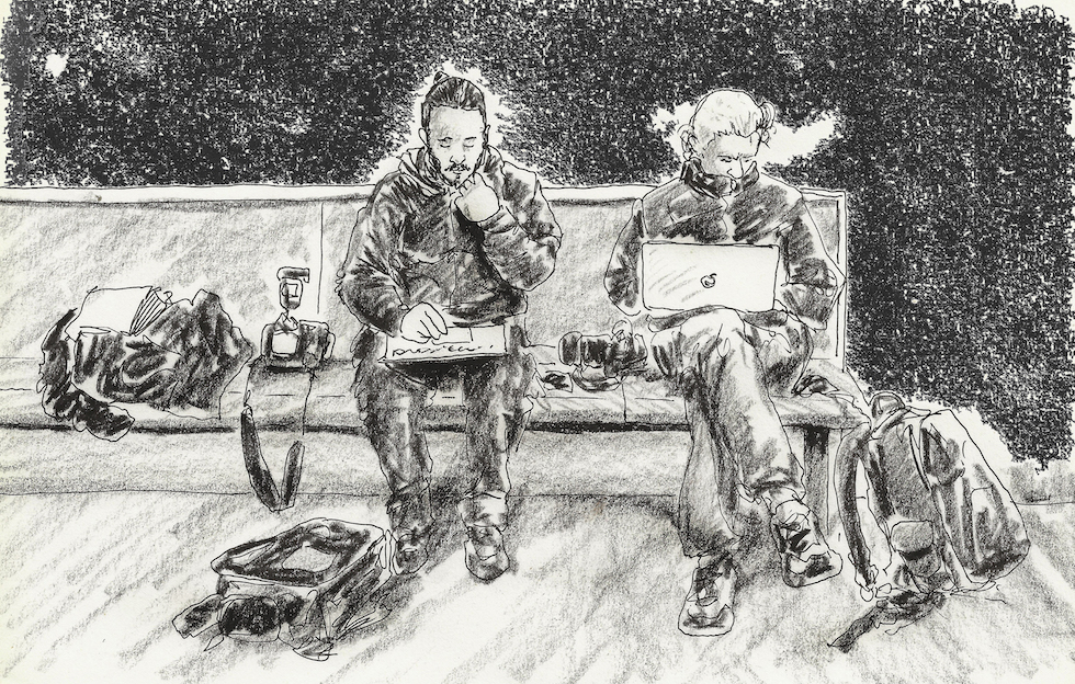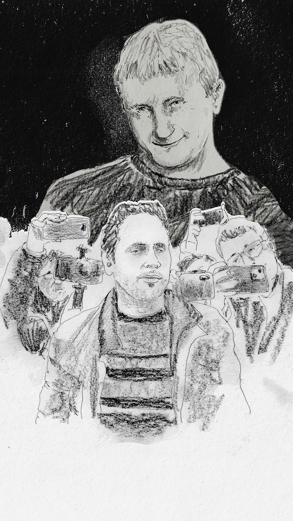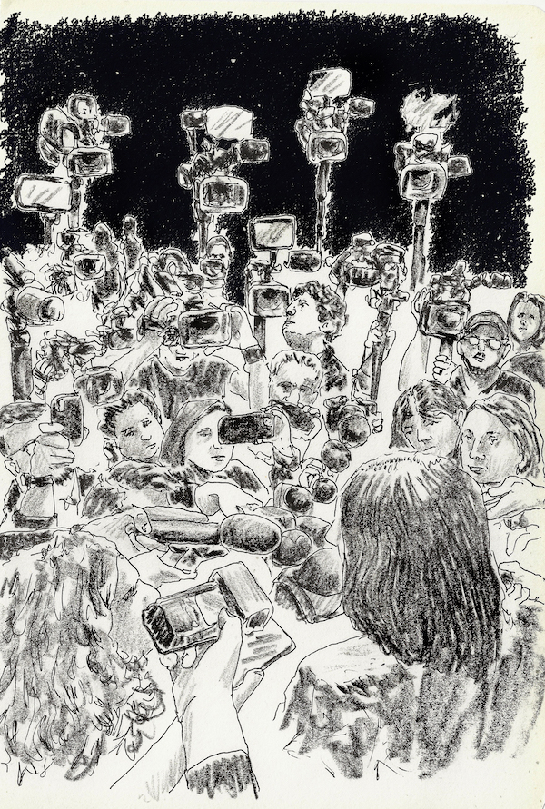All’arrivo di ogni parte in causa, un gruppo di quaranta persone si muove disordinato per raggiungere la posizione migliore e rapidamente si ricompatta a testuggine finché ognuno ha un suo spazio minimo di registrazione. Spuntano mani con microfoni da ogni angolo. Nello strato più esterno ci sono gli operatori con le aste che coprono anche la via di fuga dall’alto. Sembrano lance.