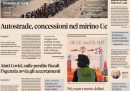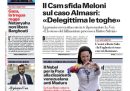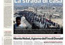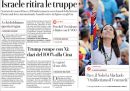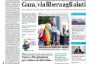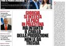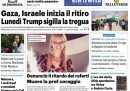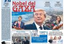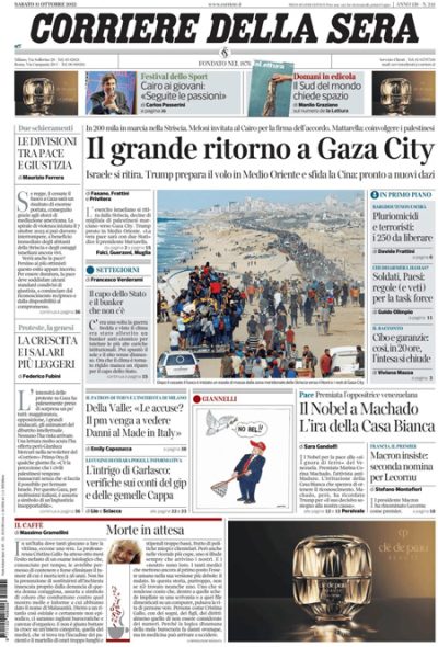 Il cessate il fuoco nella Striscia di Gaza iniziato ieri alle 12, il ritiro dell’esercito israeliano da alcune zone della Striscia secondo le previsioni dell’accordo sulla prima fase del piano di pace firmato da Israele e Hamas, e il ritorno della popolazione palestinese verso le città del nord della Striscia che avevano abbandonato per il conflitto sono le notizie in apertura su quasi tutti i giornali di oggi. Libero apre invece sull’assegnazione del Nobel per la Pace a María Corina Machado, leader dell’opposizione venezuelana, Domani si occupa della vicenda del cooperante italiano Alberto Trentini detenuto in Venezuela da quasi un anno, il Messaggero titola sui negoziati commerciali fra Stati Uniti e Cina, che non fanno progressi e hanno provocato la minaccia da parte di Trump di nuovi dazi del 100% sui prodotti cinesi, e il Fatto commenta i dati sulla produzione industriale in Italia. I giornali sportivi presentano la partita di stasera fra Italia ed Estonia per le qualificazioni ai prossimi Mondiali maschili di calcio.