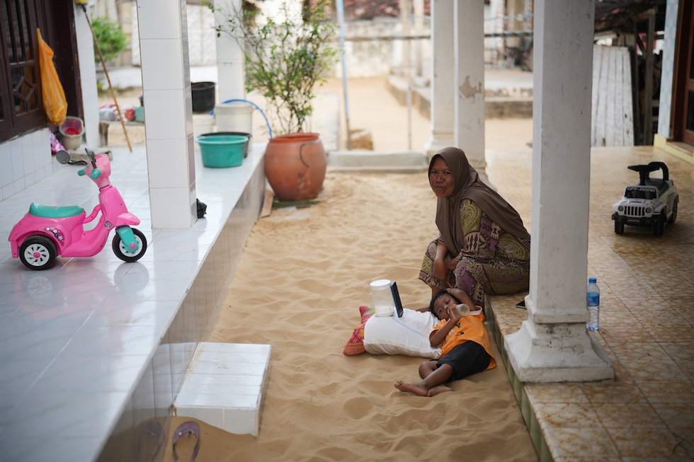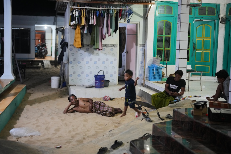 Una famiglia si rilassa nella sabbia davanti a casa, Legung Timur, 9 settembre 2025 (AP Photo/Dita Alangkara)