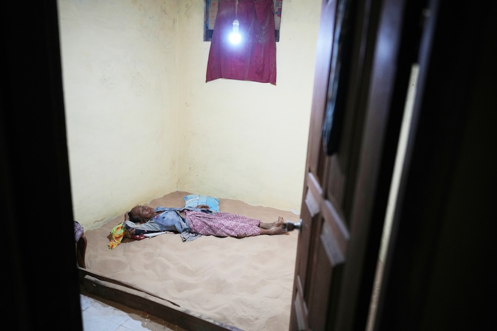 Masriani, 70 anni, dorme su un materasso di sabbia a casa sua, a Legung Timur, 9 settembre 2025 (AP Photo/Dita Alangkara)
