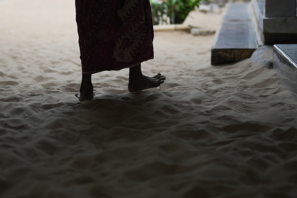 Una donna cammina nella sabbia a Legung Timur, 9 settembre 2025 (AP Photo/Dita Alangkara)