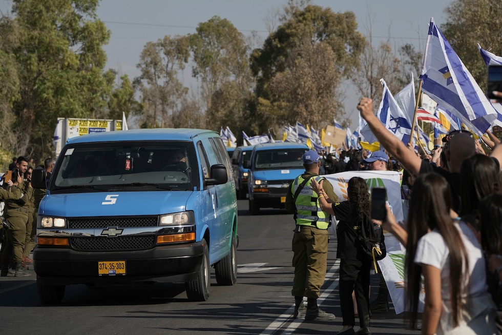 Il convoglio che trasportava alcuni degli ostaggi nel sud di Israele (AP Photo/Leo Correa)