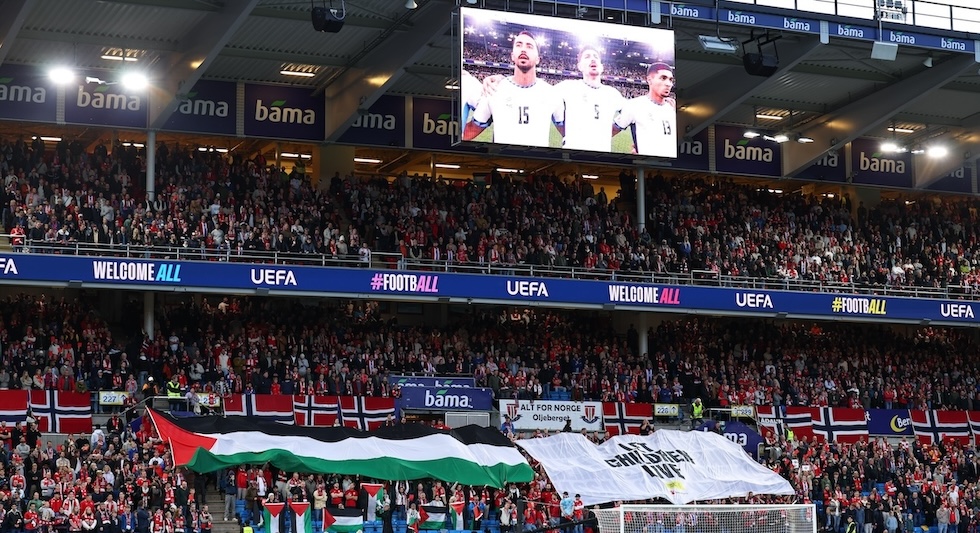 I tifosi della Norvegia con le bandiere della Palestina prima della partita di sabato scorso contro Israele (Robbie Jay Barratt – AMA/Getty Images)
