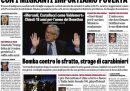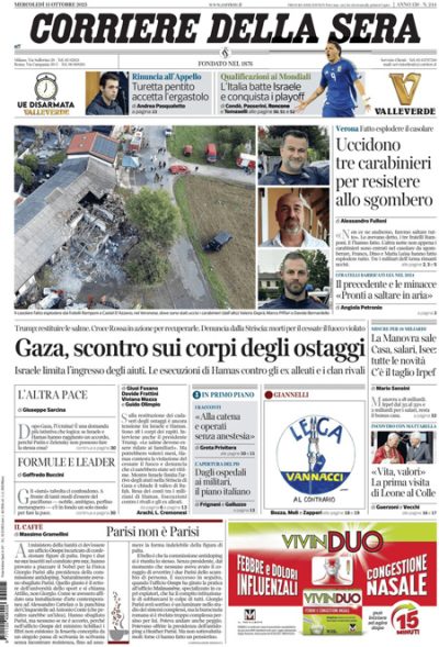 Ci sono notizie diverse in apertura sui giornali di oggi: alcuni si occupano delle anticipazioni sui contenuti della prossima legge di bilancio a cui sta lavorando il governo, altri della situazione nella Striscia di Gaza, dove Israele ha ridotto l’arrivo di aiuti umanitari per il mancato rispetto dell’impegno di Hamas a restituire i corpi degli ostaggi israeliani uccisi, altri ancora della morte di tre carabinieri vicino a Verona per l’esplosione in un’abitazione da cui stavano cercando di sgomberare gli occupanti. Avvenire e l’Osservatore Romano aprono sull’incontro al Quirinale fra il presidente della Repubblica Mattarella e papa Leone XIV, Libero sugli scontri a Udine fra la polizia e un gruppo di manifestanti che partecipavano al corteo di protesta contro la partita Italia-Israele, e i giornali sportivi commentano la vittoria dell’Italia nella partita, che le garantisce di poter partecipare almeno ai playoff per qualificarsi per i prossimi Mondiali maschili di calcio.
