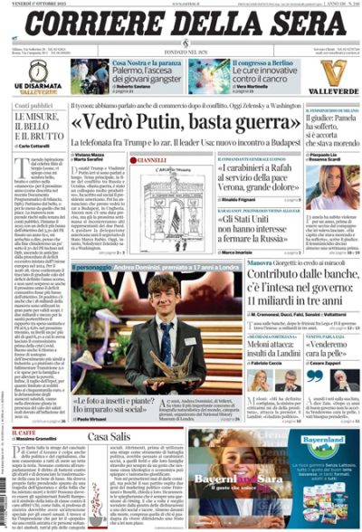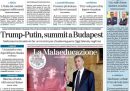Le due notizie principali in apertura sui giornali di oggi sono l’annuncio da parte del presidente degli Stati Uniti Trump che incontrerà prossimamente a Budapest il presidente russo Putin per provare a trovare un accordo per far finire la guerra fra Russia e Ucraina, annuncio arrivato dopo una telefonata fra i due, e la riunione della maggioranza di governo per definire i contenuti della prossima legge di bilancio. Qualche giornale titola poi sulla polemica fra il segretario della CGIL Landini e la presidente del Consiglio Meloni, definita da Landini “cortigiana” in una trasmissione televisiva, altri si occupano della spesa per il piano di difesa comune della Commissione europea, e Avvenire e l’Osservatore Romano titolano sull’intervento di papa Leone XIV all’assemblea della FAO.