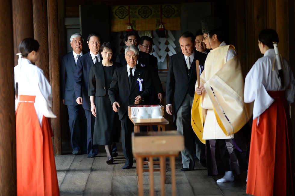 Sanae Takichi con vari ministri e parlamentari al santuario di Yasukuni, nel 2014 (Atsushi Tomura/Getty Images)