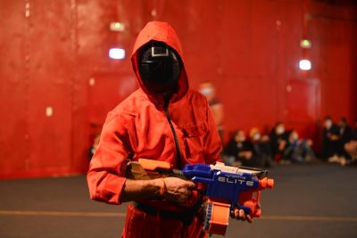 Una persona vestita da guardia di Squid Game al Torino Comics (Diego Puletto/Getty Images)