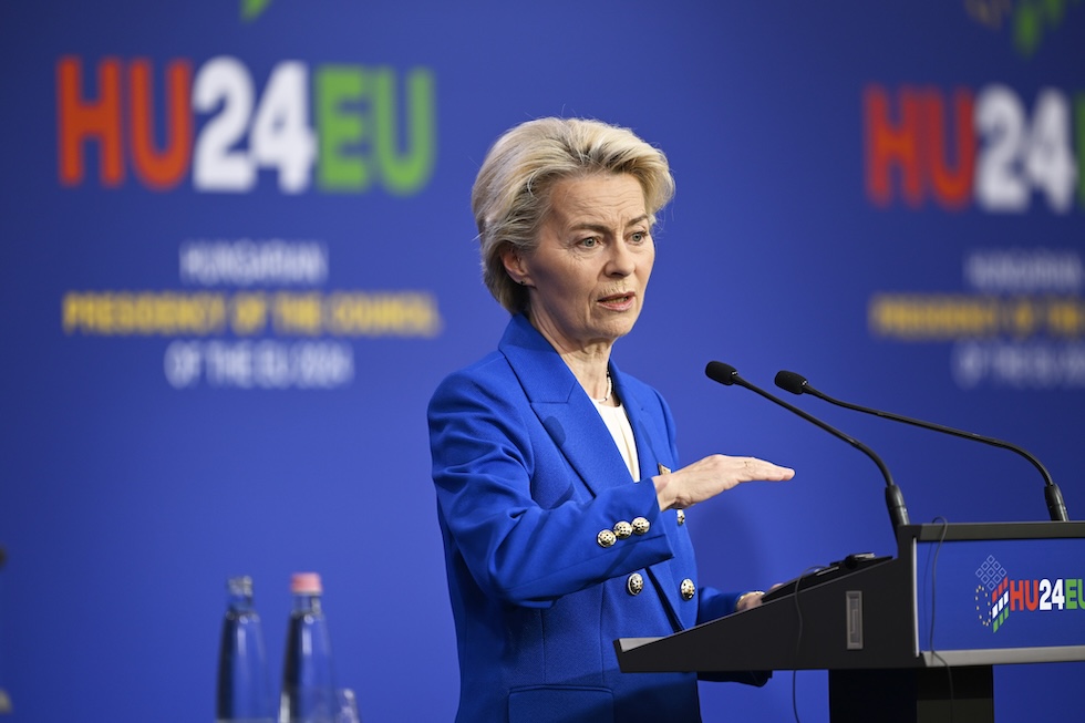 Ursula von der Leyen al termine di una conferenza sul futuro dell’Ungheria nell’Unione Europea a Budapest, l’8 novembre 2024 (AP Photo/Denes Erdos)